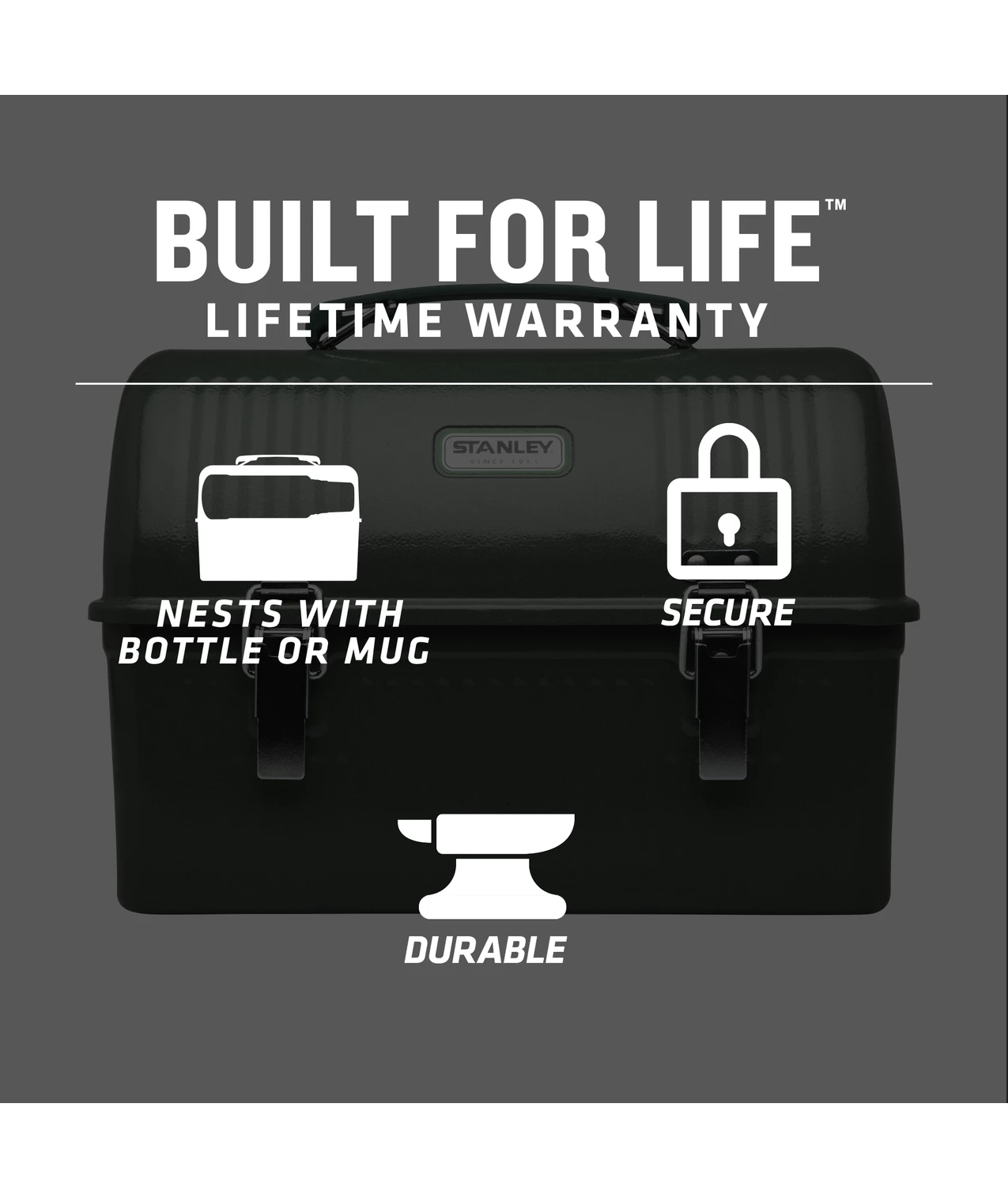 As far as vintage lunch boxes go, this oneβs a real classic. Timeless design. Durable construction. And enough room to hold all your food (lunch, snack, second snack and more). Thereβs even a metal bracket just inside the lid that can keep your full-size Stanley Vacuum Bottle or Mug secure.