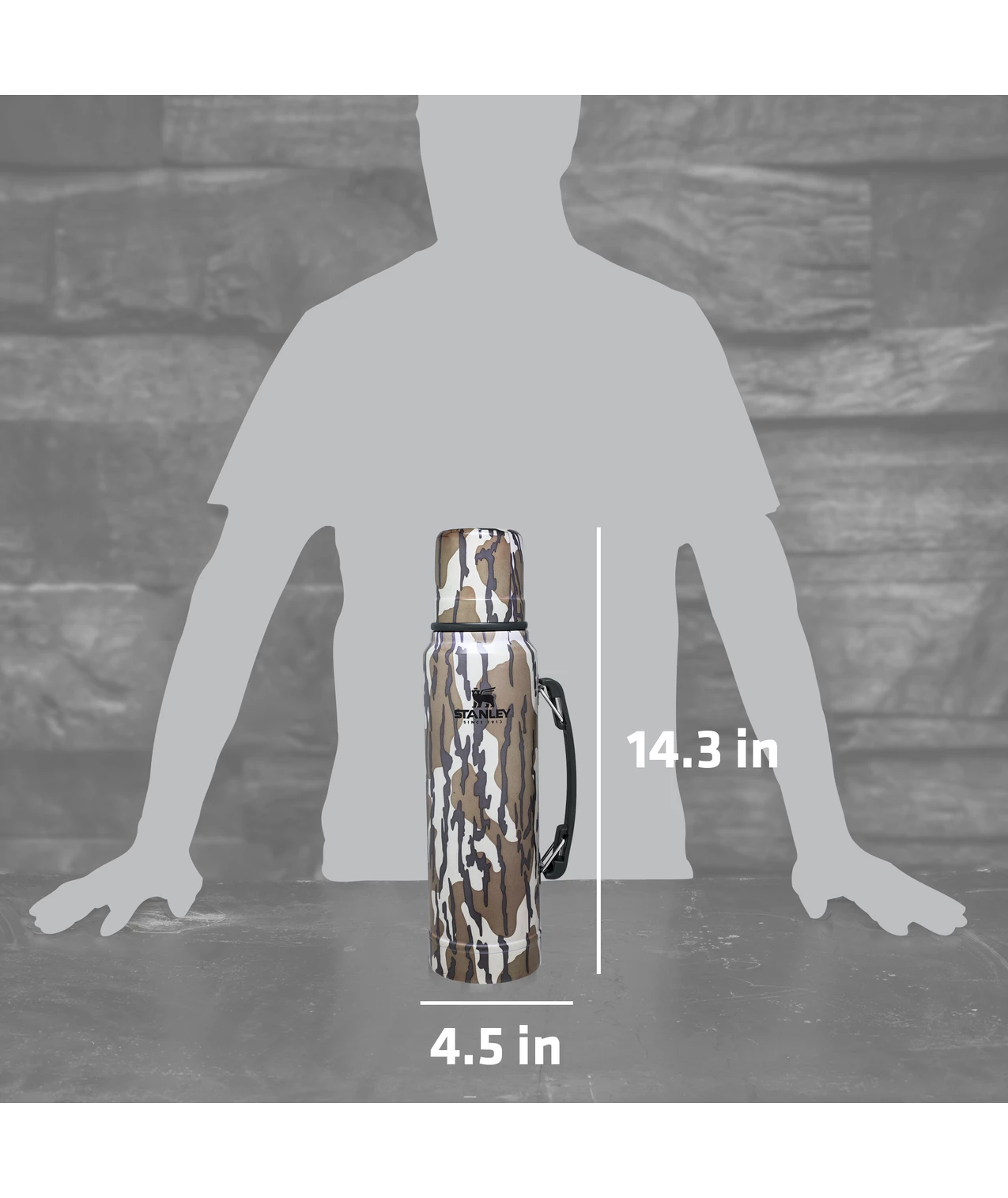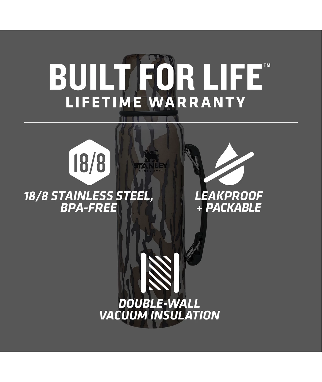 Bottomland, the pattern that launched Mossy Oak 35 years ago, features bark, sticks, and leaves to help hunters effortlessly blend into their environments. Combining Mossy Oak camo with this timeless, rugged 1.1 quart Stanley bottle, built to withstand the toughest treatment, makes this the perfect companion for your next hunt, fish, or work adventure. The packable, leakproof bottle keeps hot drinks hot or cold drinks cold for 24 hours.
