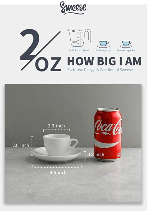 Size:Β 2Β Ounces cups, 4.6 inches saucers