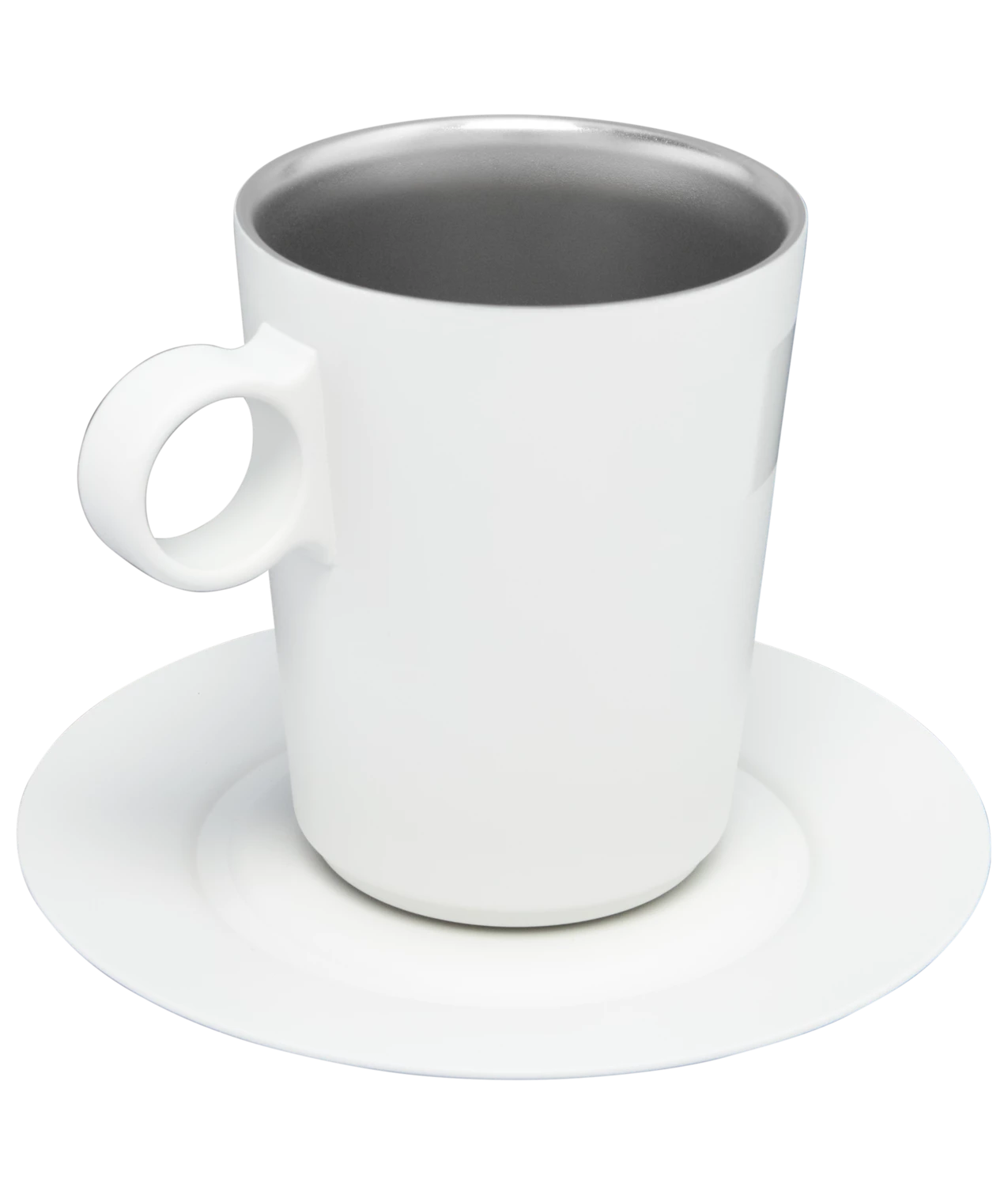 There’s a non-slip silicone base on the Latte Mug and Stillness Saucer for a quiet, stay-still landing. The double-wall vacuum insulation keeps your drink nice and hot (or chilled) from the first sip to the last. And the circular handle makes the cup truly comfortable to hold.